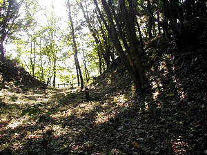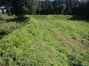 1郭と4郭との間の空堀(こ)。右手が1郭である。この堀の幅は10mほど、両脇の郭の高さは1郭側が4m、4郭側が1,5mほどである。