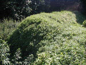3郭の南側の堀(け)。手前の土塁はとても高く、5mほどある。この部分が特に高いのは、城外側と隔絶するためであると思われるが、一方そのわりに、(あ)の方向には、深さ2mほどのたいして規模の大きくない堀があるだけなのである。こちら側は城外と隔絶といったイメージではない。こういうところが、この城のよく分からない所である。