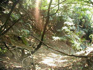 4郭脇の空堀。薬研堀である。ここを旧沼田街道が通っていたという。深さ2m、幅3mほどですぐ両脇の郭に登れてしまうので、防備的にはどうであろうか。ただ、人一人がやっと通れる程度の幅なので、ここを敵が進んでくる場合、一列縦隊にしかなれず、側面や正面から攻撃するにはちょうどよいかもしれない。
