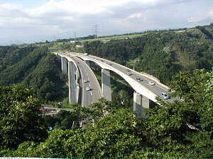 長井坂城から見た関越道。この高架は下から100m近い高さがある。いつも関越でこの橋を通るたびに、沼田郊外を眺望しながら「すごく高くて眺めがよいなあ」と思っていたのだが、その上が長井坂城であるとは気がつかなかった。帰省のときにいつも通っている道を、上から眺めることができるというのは実に新鮮な気分であった。