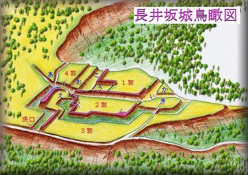 長井坂城は、関越道の長井坂トンネルの上にある。下の利根川からの比高200mという断崖絶壁の上である。この急峻な段丘上の崖っぷちに城は築かれている。鳥瞰図は東方上空から見たものであるが、西の利根川方向はかなり郭が脱落した感じがあり、往時はもっと西側に郭が出っ張っていた可能性がある。城址は畑地となって一部改変されているので、埋められたと思われる部分も若干補って描いてある。この台地上に上がるにはそれこそ長井坂を上ってくるしかなく、それがこの城の名前の由来であろうか。