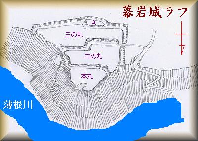 「日本城郭体系」の図を基にして幕岩城のラフを描いてみるとざっとこんな感じになる。台地上には歓楽院という寺院があり、その脇に城址の案内板があるが、宅地化が進んでおり、遺構はほぼ隠滅状態にある。