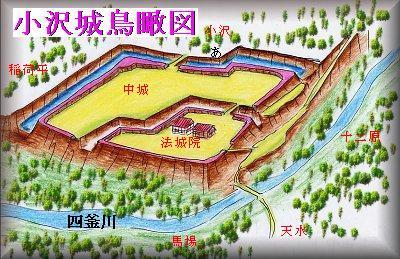 鳥瞰図は東南上空から見たもの。現在、内堀は失われているが、外堀と土塁は良く残っている。四釜川に臨む比高20mほどの台地端に位置している。二重の堀で実城と中城の2つの郭を形成している。