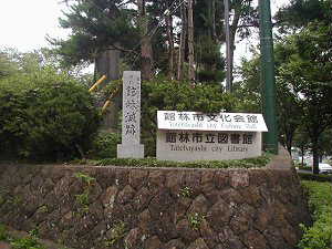 文化会館入口にある城址碑。城址碑そのものはあちこちにある。近代の石垣の上にあるが、これは三の丸の土塁の塁上である。図の(あ)の辺りであろう。土塁はかなり改変されているので、幅、高さが旧状通りであるとはとても思えない状態である。