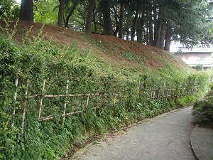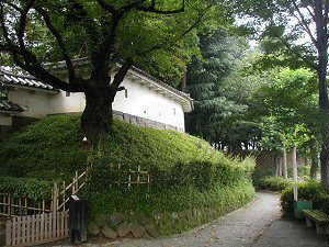 三の丸土塁を外側から見た所である。古写真を見ると、この外側は幅20m以上はありそうな水堀が広がっていたようである。現在では埋め立てられて駐車場になっている。