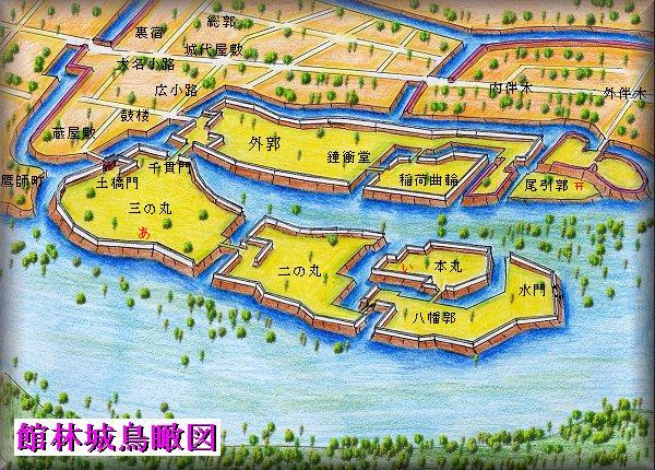 03.8.2、今回、久しぶりに館林城を訪れたが、やはり城を再現できるほどの遺構は残ってはいない。仕方がないので、主に「城郭体系」の図を基にして、再現図を試みてみた。鳥瞰図は城を南方上空から見たもの。館林城については古図もいくつか残されているが、建物が分かるものがないので、今回は縄張りだけの復元にしておいた。