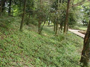 城外とを隔てる土塁。大分変形しているらしく、斜面はとても緩やかになっている。土塁基部の幅はかなりあるが、高さは現状では2m未満である。外側の堀もあらかた埋まってしまっていて、痕跡程度にしか見えない。