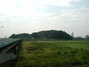 北側の岩井橋の手前から見た岩井山城。目立つ山なので場所はすぐ分かる。橋が架かっている部分は渡良瀬川の氾濫原であるが、かつてはここにも川が流れ込んでいたかもしれない。
