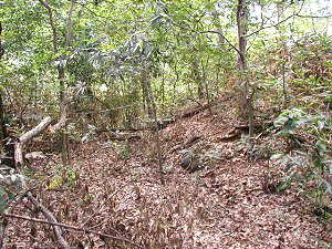 (あ)の部分の城塁。横矢のように張り出した部分である。しかし、高さは1m余りで、塁も切岸状にはなっていない。