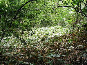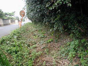 (い)の腰曲輪。しかし一段低く草が茂っているので、まるで堀のように見える。もしかすると本当に堀なのか? しかし薮がひどくて形状を確認することができない。