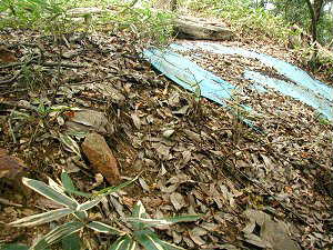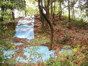 1郭の東側城塁には青いビニールシートが被せられている。石垣が出たというのはここにことなのであろうか。しかしびっしりシートが被っていてよく分からない。しかし、その脇にも石ころが数個並んでいる所がある。これがその石垣の一部なのか。しかし、これは石垣というよりは崩落防止のための石留めであるようにみえる。