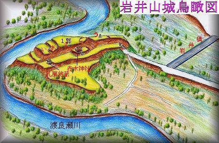岩井山城は勧農城ともいい、渡良瀬川に臨む比高25mほどの台地上にある。渡良瀬川は岩井山城の手前で南に湾曲し、城山を取り巻くようにカーブしている。その部分の先端部が城山である。城山の北側方向にも湿地帯が入り組み、かつての川はこちら側にも流れていたかもしれない。つまり川の中州に存在した独立丘であった可能性がある。鳥瞰図は東南上空から見たものである。一応ざっと歩いてみたのだが、郭の形態が十分に把握できておらず、かなり違っているかもしれない。一応のイメージ図といった程度のものである。