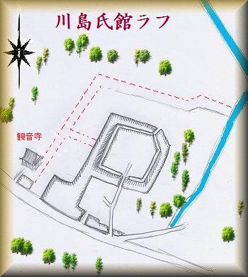 川島氏館は、高松にあるので高松城とも呼ばれ、観音寺の東南150mほどの所にある。観音寺の東南側は幅20mほどの低地になっているが、これも外堀の名残であるらしい。さらに進むと道が二股に分かれているところ(石造供養搭がある所である)の手前の左側の壁に「←居館跡」という案内が見えてくる。しかし小さいので注意してみないと見落としてしまいそうだ。