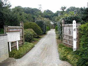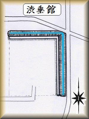 渋垂館は、勝光寺の南西100mほどの所にある。勝光寺から南西方向を見ると、十字路の角に垣根を巡らせた一角が目に入る。ここが渋垂館の跡である。館には50mほど堀が残っているのであるが、この残存部分の外側には上記の垣根があり内部を見えなくしてあるので、一見堀があるとは分からない。しかし、垣根をかき分けると、写真のように堀があるのが分かる。底ははじめじめとしてぬかるみ、水堀であったことは明らかである。高さ2mほどの土塁もある。
