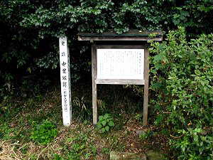 矢印に沿って進んでいくと一見の民家があり、その脇に「居館跡」という標柱と案内板がある。ここが虎口であるらしい。