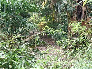 東側の下にテラス上の空間があり、ここに赤木神社と乳房地蔵尊がある。この辺りまでが城の中心ということになろう。しかし、堀切や土塁などの明確な遺構はなく、城としてはかなり古い形式のものである。1郭やその周辺の郭も、作平が甘く、地勢が斜めになっている所が多い。