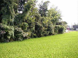 八椚城は毛野小学校のすぐ東南側にある。水田の中に土塁の一部が残っているが、残存している遺構はこの北側の部分らしく、あとは耕地整理や宅地化に伴って埋められてしまったらしい。