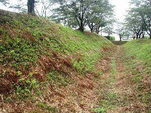 (い)の土橋の部分から西側を見た所である。堀は深さ5m、幅8mほどである。きれいに薬研堀に削られている。図ではつい水堀のようにしてしまったが、これはやはりもともと空堀であったと見たほうがよいかも知れない。
