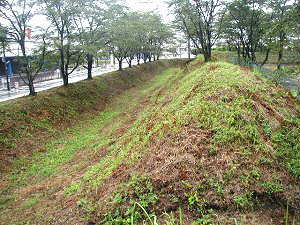 郭内の様子。なぜか土塁の内側に金網を巡らせている。登るなということなのだろうか。