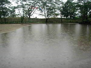 雨がひどく降っているために、郭内には水が溜り、まるで全面が池のようになっている。