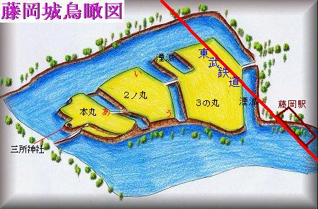藤岡城を南西上空から見てみた。現在、本丸と2の丸、その間の堀が残っているが、基本的に平城のため、耕地整理や工場の建設などであちこち改変されており、一見ただの水田地帯にしか見えない。3の丸には東武鉄道の線路が通っており、また宅地化などにより、遺構は破壊されている。