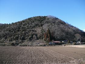| 南側からみた石下城。 | 北東側の源治神社のところから接近していくと、山への入り口が見えてくる。途中ヤブ化しているが、なんとか上まで道は続いている。 |