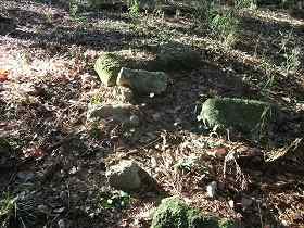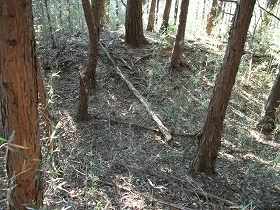 1郭の中央付近には、切石がいくつか転がっていた。神社か何かの跡なのであろう。とすると、現在もかろうじて残っている山頂までの道は、もともとはこの神社の参道であったのかもしれない。