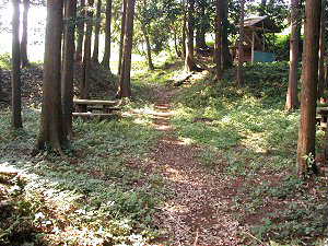 さて、この看板があるのでちゃんとした道がついているかと思うとこれが大間違い。この道を進んでいくと5mほど高い1郭があり、そこにお堂があるのであるが、その先はもう道はない。仕方がないので山の斜面を直行する。それで15,6mほど登ると、もう郭らしいところに出る。