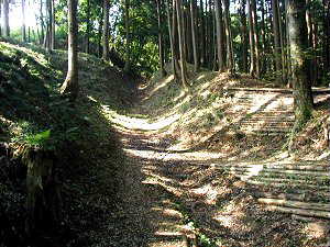 本丸の下には数段の腰曲輪のような郭がある。本丸に登る道は切通しになっており、両脇の郭から、下を通る敵を狙い撃ちできる構造である。