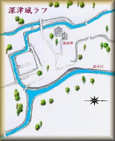 深津城は、武子川に臨み、宇都宮市との境界近くにある、延命寺の境内となっている。現状では方100mほどの居館の跡であると思われるが、かつては外郭部もあったといい、二重の堀を備えた方200mほどもある城館であったらしい。