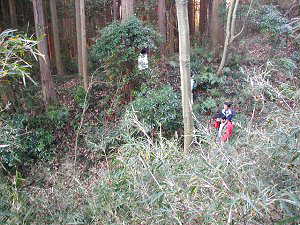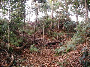 岩上左京大夫曲輪の(あ)の堀底。両側の城塁に折れがあるのが分かるであろうか。ここは虎口のようにも見えるのだが、実際はどうだったであろうか。