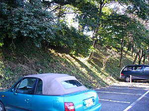 本丸の東側には土塁、犬走りと続き、その先が断崖となっており、この下に市営の駐車場がある。1時間までは無料なので、城を見るにはここに車を止めておくといい。