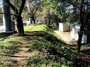 本丸東側の土塁と腰曲輪。左手の土塁の内側が野球場である。右側の置くにも土塁があり、その先が横矢の張り出しのようにも見える。この腰曲輪は進んでいくにつれだんだん狭くなり、最後は幅1mほどの犬走りになってしまう。