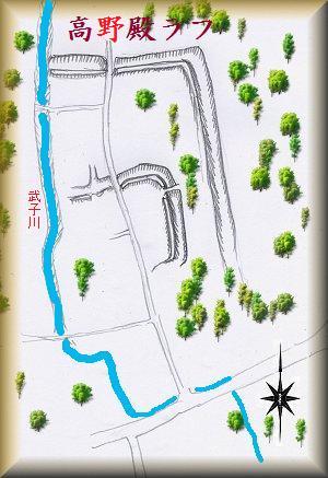 高野殿は厚生年金休暇センターの西南西750mほどの所にある。県道268号線の「原」の信号の所から厚生年金センターの方に向かって進むと、武子川を渡る。ここを渡って200mほどの北側のちょっと奥まった辺りが高野殿である。ここには現在も高野家の屋敷があり、家の門には「高野殿」という額が掲げてある。そのさらに奥に進むと土塁や堀の跡が見られるのだが、写真の通りの薮で、この時期にはほとんどなんだか分からない状態である。館は方50mほどの単郭方形のものであった。