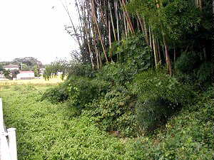 写真は外側の堀で、深さ2m、幅4mほどのものである。現状では空堀であるが、もともとは水堀であった可能性もある。