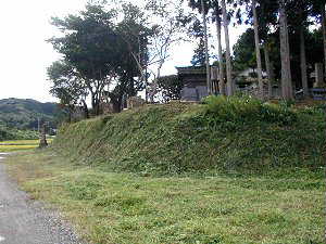 郭内を城外側から見た所。3mほどの高さの切岸状の城塁の上に腰曲輪があり、その上に土塁が乗っている。遠目にも2段構造になっているのがよく分かるであろう。土塁には切れがあり、この部分が虎口であったかと思われる。