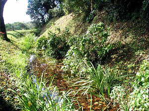山門の脇の左側の部分。この辺りには水堀らしい痕跡がはっきりと残っている。