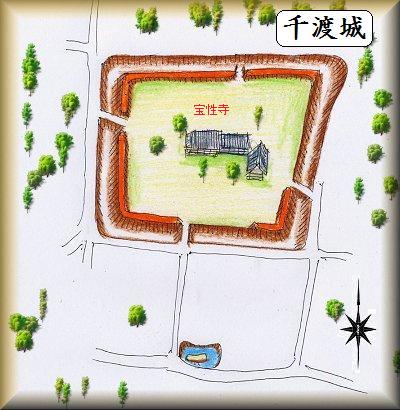 千渡城は上城とも言い、城址は宝性寺の境内となっている。方100mほどのこの寺院の周囲には深さ5m、幅8mほどの堀がぐるりと取り巻いている。写真は南西角の部分で櫓台のように高くなっているのだが、実際には櫓を建てるほどのスペースはない。