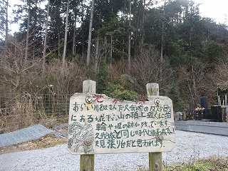 | 南西から遠望する老沢城。 | 山麓に子供の描いた手書きの案内板が設置されていた。ほほえましくなる。 |