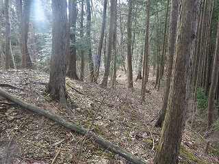 そうして尾根を登って行くと、2郭の東側下の切岸とテラス状の小郭のところに出た。ここまで来れば、あと20mほど直登すれば、もう2郭内部に入ることができる。