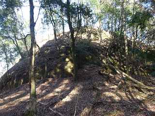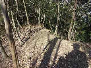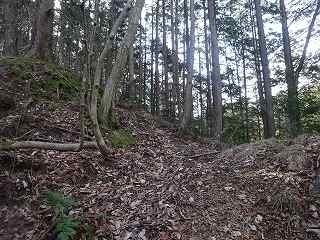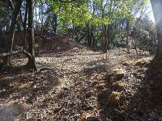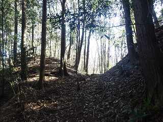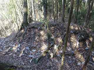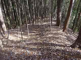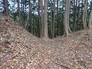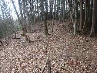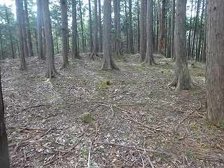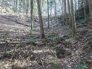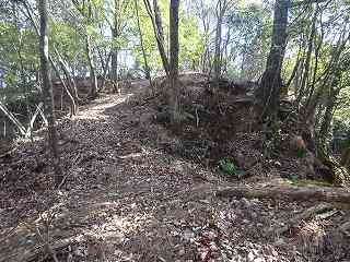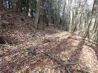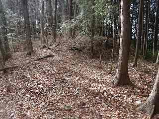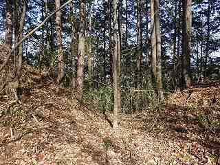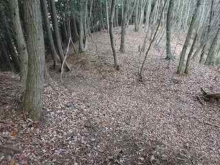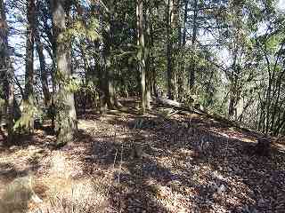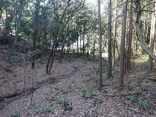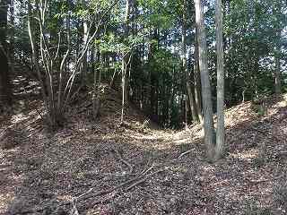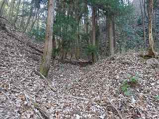 1郭は長軸30mほどで、城内では最大の広さのものである。そのまま真っすぐ進んで行くと低い土塁があり、その先はやや傾斜地形になって行く。その先に堀切があって、城域は終了する。