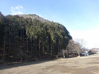 | 北西側下の公園から遠望する諏訪山北城。ここから山頂までの比高は80mほど。 | 2郭東側下にあるテラス状郭と切岸。 |