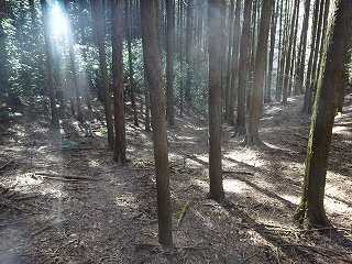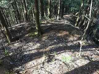 | 1郭から尾根続きに下方へ目指していく。 | 尾根の先端部にある小規模な堀切と竪堀。 |