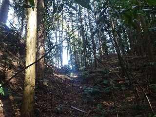 | 1郭の地勢は西側に降って行き、その先に堀切がある。 | 堀切の底から1郭城塁南側を通る帯曲輪。 |