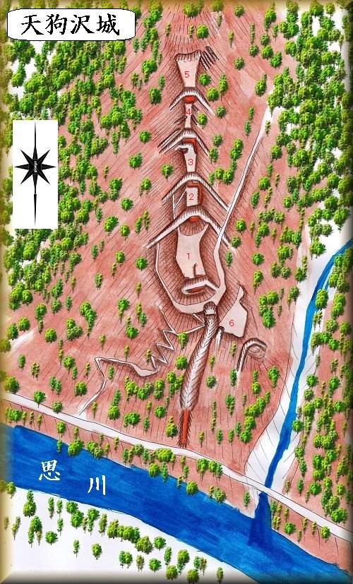 天狗沢城は、思川に突き出した山稜を数本の堀切によって区画した連郭式山城であったようだ。