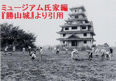 昭和50年、勝山城の本丸跡に天守、結婚式場、プールなどが建設され、一時期、本丸はレジャー施設化していたという。しかし、わずか3年ほどでレジャー施設は、倒産してしまう。その後しばらく、本丸跡地は草ぼうぼうのまま放置されていたというが、昭和56年、土地の買取が成功し、本丸は城址公園として整備されることになった。これはその翌年、発掘調査が行われている時の写真であるらしい。この時模擬天守はまだ健在であったが、この後取り壊されてしまった。