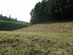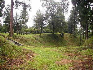 | 北久保不動尊のすぐ脇の土手。傾斜はゆるやかで、東北自動車道の建設に伴って削られたものであると思われる。 | 西側の2段横堀のうちの下の横堀。城塁の高さは6mほどある。 |