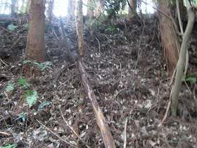 この横堀の南の端は、写真では分かりにくいが断崖絶壁である。天然の竪堀といった感じである。 |