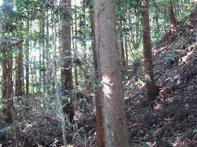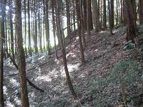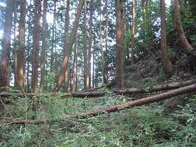 | 1郭の城塁。非常に急峻な切岸であり、直登するのはなかなか大変である。 | 1郭北側の城塁。やや横矢が架かっているようにも見える。この下も横堀になっているが、なにしろヤブがひどすぎる。 |