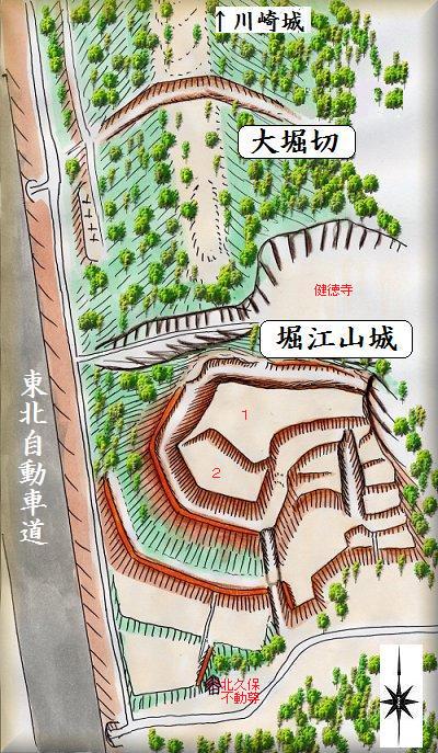 堀江山城は、川崎城の東南600mほどの所に位置している。健徳寺の南側にそびえる比高30mほどの独立山が城址となっている。また、健徳寺の北側150mほど進んだところには大堀切があって、城址の北側の山稜をさらにに分割している。